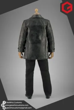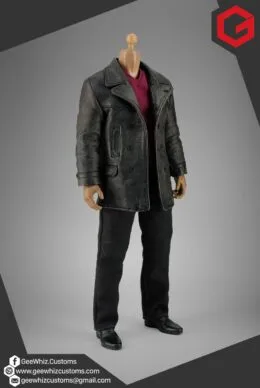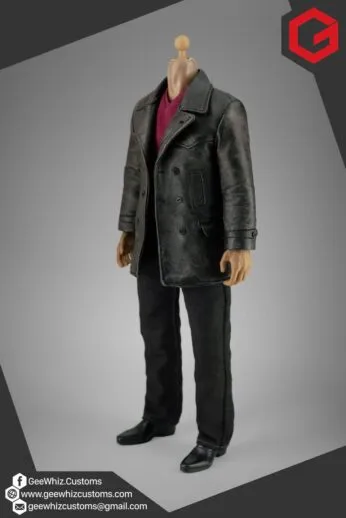 The set features his iconic black leather jacket, meticulously weathered for screen-authentic realism, paired with tailored black jeans and a deep red jumper—carefully proportioned and constructed to achieve a natural drape and true-to-series silhouette in sixth scale.